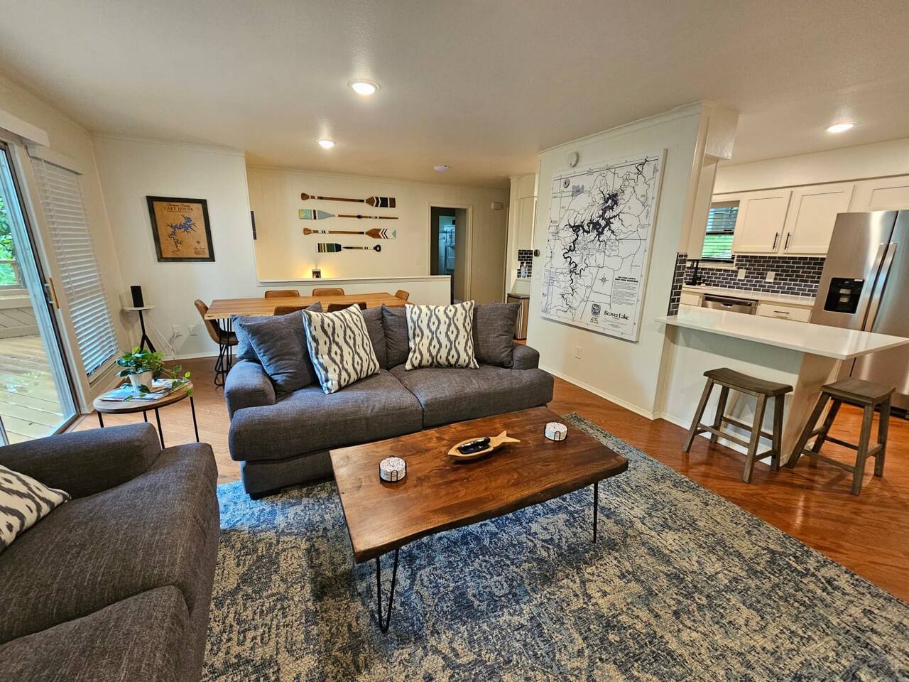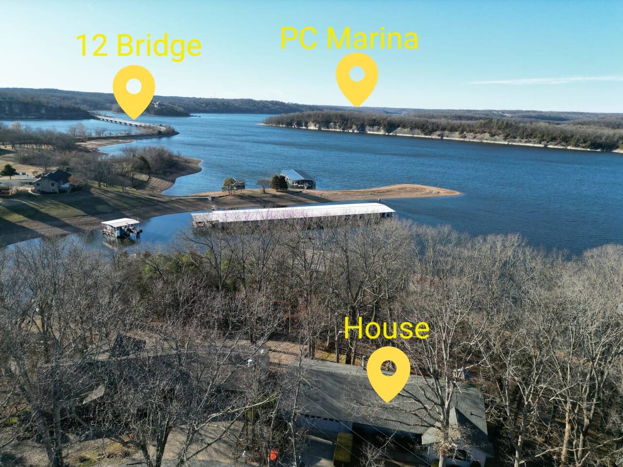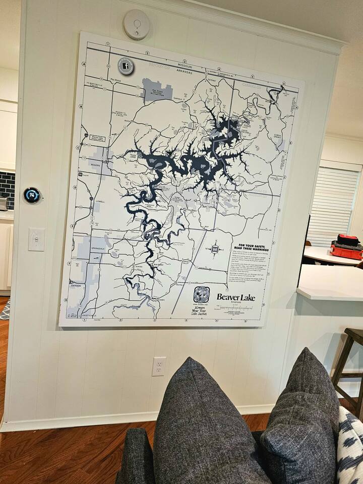 2400sqft 4 bedroom 3 bath house situated lakefront on Beaver Lake. There are 3 bedrooms with King beds and 1 Bedroom featuring 2 sets of twin over full bunks. The house is tastefully decorated with comfortable seating. This house has tons of deck space to accommodate and entertain up to 12 guests