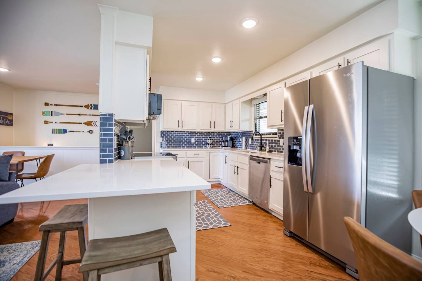 Ready for a relaxing week or long weekend on the lake with the family or extended family? This is your spot. Water front with direct water access. Pay special attention to the bedroom layout featuring 3 king bedrooms and a bunkroom for the kids with 2x Twin over Full bunks. Entertainment includes a BT Speaker, Soundbar, 2x Arcade games, Basketball game and 4 kayaks available cruise the quite cove or fish. This property is also very well situated for MTBikers looking to explore the Hobbs area or