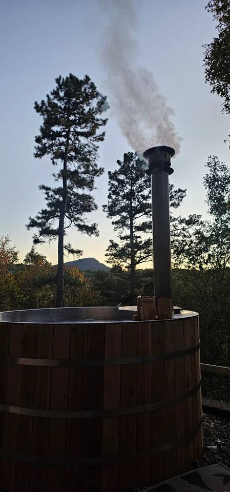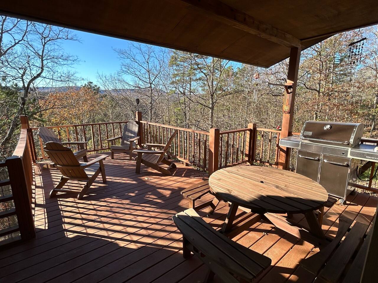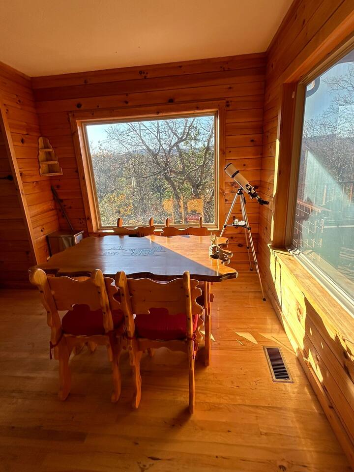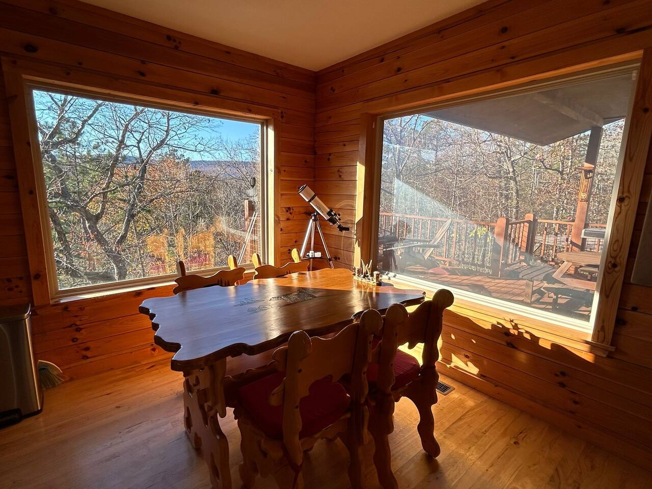 Living Room Step into the cozy living area, featuring plush seating and a gas fireplace—the perfect spot to unwind after a day of outdoor adventures. Large windows offer beautiful views of the surrounding mountains, and the open layout creates a welcoming, communal space. Kitchen & Dining Area Our fully equipped kitchen comes with everything you need to prepare meals, from cookware to utensils. Adjacent to the kitchen is the dining area, with a table that seats the whole family, ideal for sharing meals together while enjoying views of the valley. Master Bedroom The master suite offers a king-sized bed with soft linens and plenty of natural light. This room is a restful retreat, perfect for unwinding at the end of the day. Bedroom 2 This second bedroom features a queen-sized bed with comfortable bedding and a peaceful, rustic ambiance. Bunk Room Designed with kids and families in mind, the bunk room includes two twin bunk beds (4 beds total), along with a retro video game system for hours of entertainment. It’s the perfect spot for the younger guests to have their own space. Bathrooms There are two clean, well-maintained bathrooms with all the essentials, including towels and toiletries. Outdoor Deck Step out onto the large deck to take in the breathtaking views of Mt. Sherman and the Little Buffalo River Valley. There's an outdoor dining area for meals al fresco, plus plenty of seating to enjoy the scenery. Hot Tub & Fire Pit The Alumitub wood-fired hot tub offers a unique and relaxing way to soak in nature, while the nearby fire pit is perfect for s’mores and storytelling under the stars. Garage & Game Area The garage is equipped with a ping pong table, foosball, and a Baggo game for added entertainment. It’s a great indoor option for family fun.