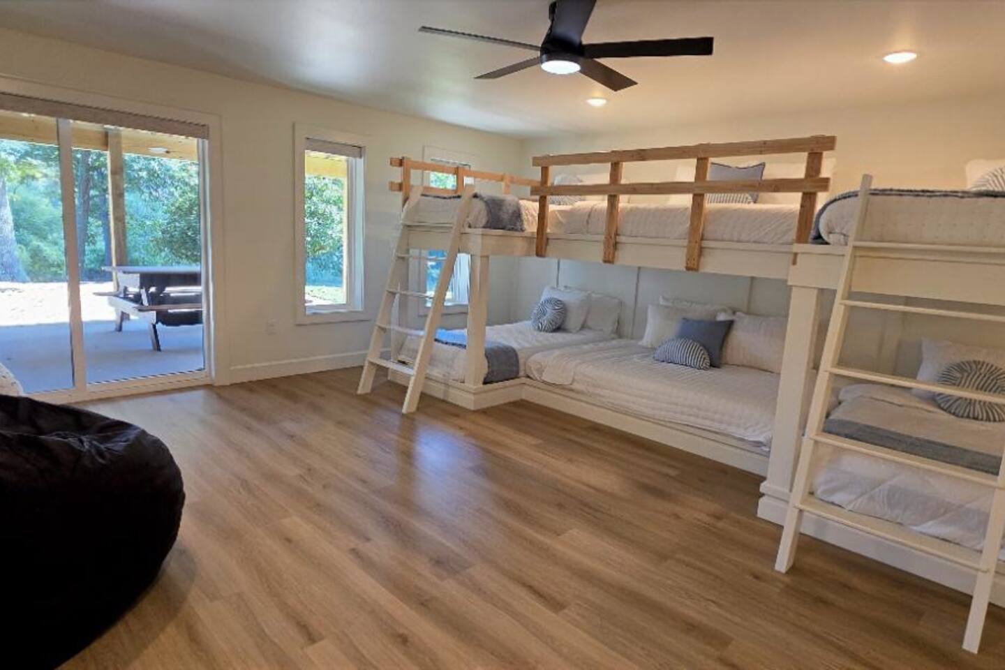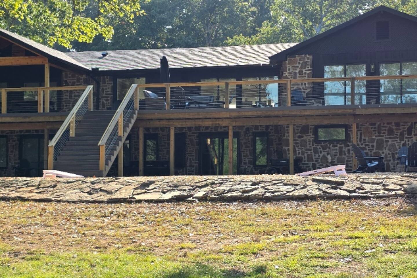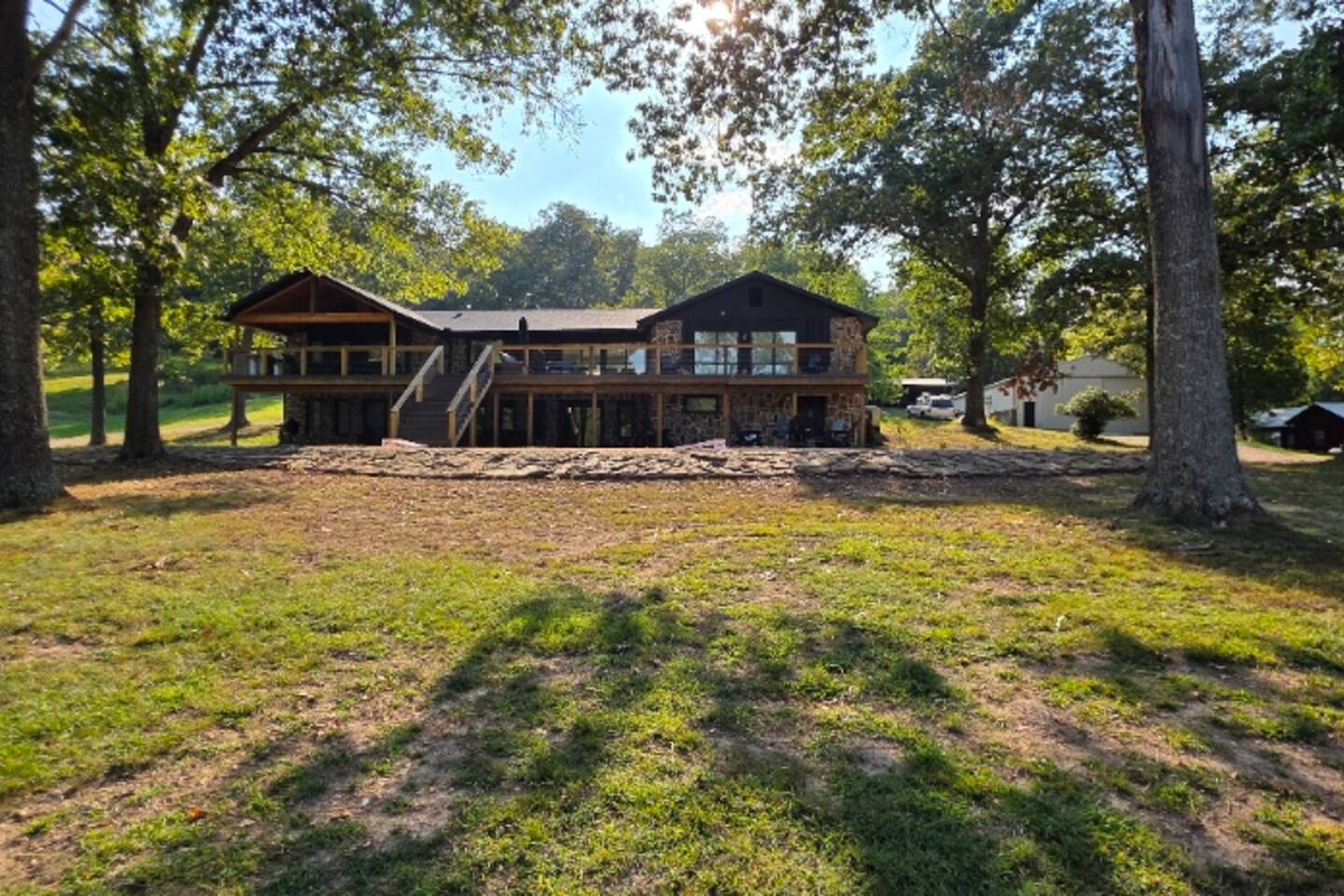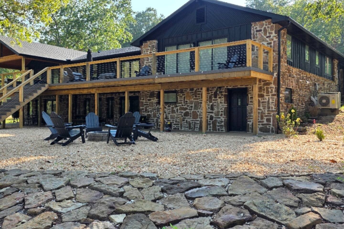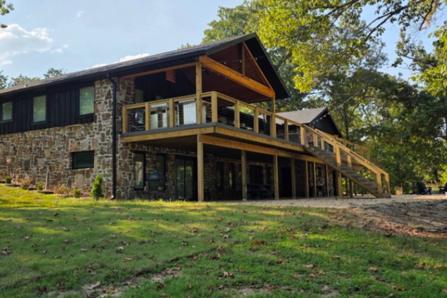 Welcome to The Fjord — a luxury retreat on Beaver Lake designed for families, friends, and groups who want more than just a place to stay. This 5,000 sq. ft. lakefront home sits on a private 4-acre parcel, blending modern finishes with resort-style amenities. Just 7 minutes from downtown Rogers — where you’ll find fine dining, nightlife, and boutique shopping — yet tucked away enough to feel secluded, The Fjord offers the best of both worlds. Inside, the upstairs living area features soaring ceilings, two plush sofas, two accent chairs, and panoramic views of the surrounding trees. The chef’s kitchen is fully outfitted with Thermador appliances, a farmhouse sink, and expansive counters — perfect for preparing meals together or bringing in a private chef. A Sonos sound system fills the main living room and back patio with music at the touch of a button. The sleeping arrangements are designed with flexibility in mind: 4 King Bedrooms (two with ensuite baths, two sharing a spacious bath) The “Little Kids” Room with 2 twin beds The Bunk Room with 4 Twin XLs and 2 Queens in a custom bunk configuration — plus two full bathrooms for convenience In total, The Fjord offers comfortably arranged accommodations for large groups with both privacy and togetherness in mind. Entertainment is at the heart of this property. The downstairs den features a lounge-style sectional, pub table, and bar seating, alongside an arcade with foosball, pop-a-shot basketball, and classic arcade games. Step outside to the expansive patios and enjoy the six-person Jacuzzi hot tub, a Blaze grill and griddle, and a Big Green Egg for those who prefer charcoal cooking. After dinner, gather around the firepit or challenge friends to a game of baggo under 100 feet of string lights designed for ambience without attracting bugs. The sports barn is where The Fjord sets itself apart — a full-size indoor pickleball court, finished with professional surfacing and ready for year-round play. Unlike many homes on Beaver Lake, The Fjord has access to Walmart delivery, Uber Eats, and Uber, making it as convenient as it is luxurious. *Why Guests Love The Fjord* -Resort-style amenities in a private home -Designed with large groups in mind (ample beds, multiple baths, spacious common areas) -Easy access to downtown Rogers nightlife and dining -Rare indoor pickleball barn for year-round play This property was built to bring people together — whether for a relaxing weekend away, a family reunion, or simply time spent with the people who matter most. Multiple outdoor cooking and gathering spaces